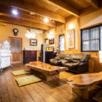 集成材ではない天然無垢の木、自然石を多用した空間は赤ちゃんも静か・・・。