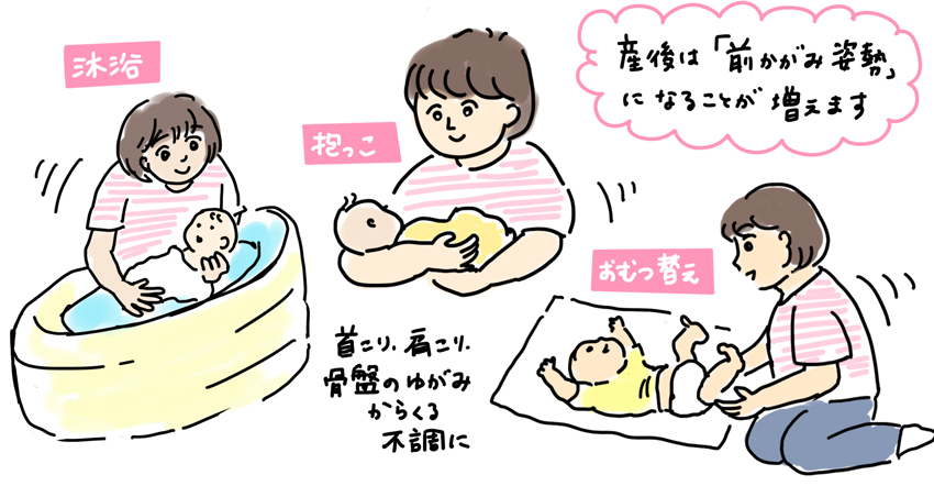 特に産後は、抱っこ・授乳・おむつ替え・沐浴など前かがみ姿勢が圧倒的に増えます。